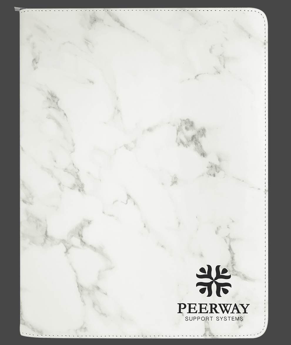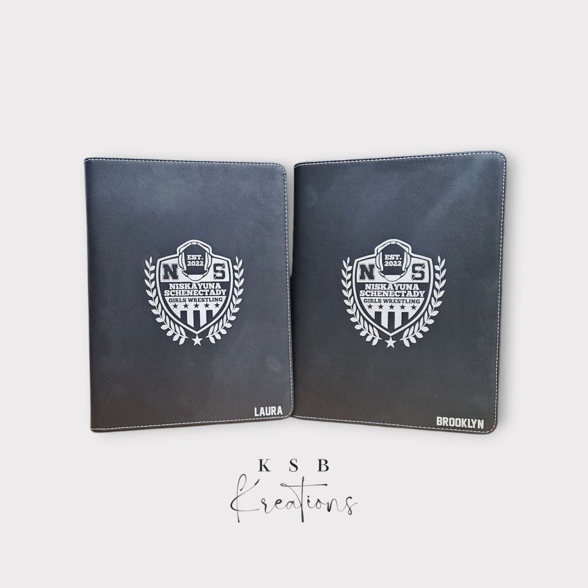 9 1/2in by 12in Zippered Leatherette Portfolio with legal pad and pen loop. Portfolio also includes inside pocket and business card holder.